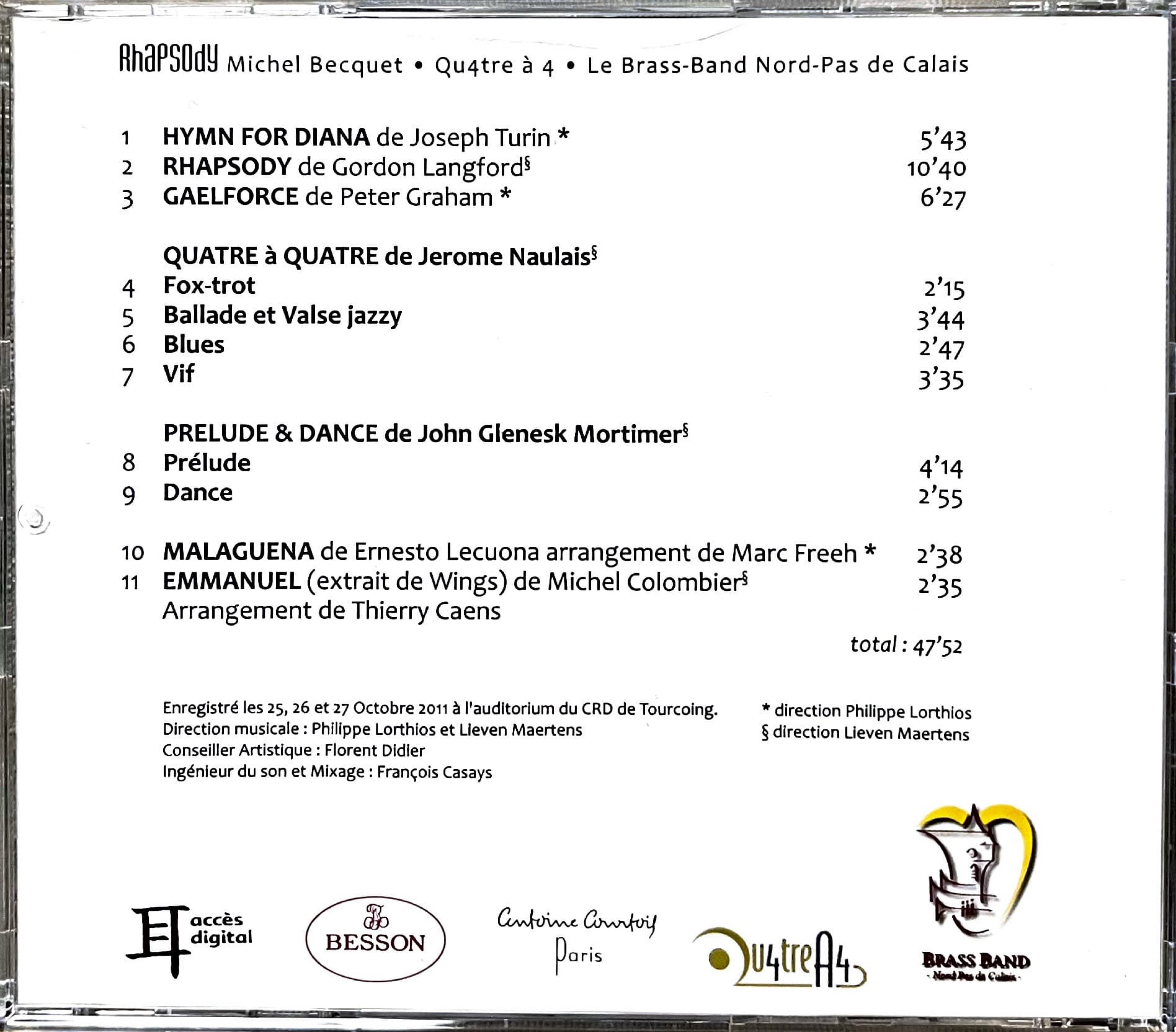 ①Hymn For Diana-Joseph Turin ②Rhapsody-Gordon Langford ③Gaelforce-Peter Graham ④Quatre A Quatre-Fox-trot-Jérôme Naulais ⑤Quatre A Quatre-Ballade Et Valse Jazzy-Jérôme Naulais ⑥Quatre A Quatre-Blues-Jérôme Naulais ⑦Quatre A Quatre-Vif-Jérôme Naulais ⑧Prelude&Dance-Prélude-John Glenesk Mortimer ⑨Prelude&Dance-Dance-John Glenesk Mortimer ⑩Malaguena-Ernesto Lecuona(arr.Marc Freeh) ⑪Emmanuel (Extrait De Wings)-Michel Colombier(arr.Thierry Caens)