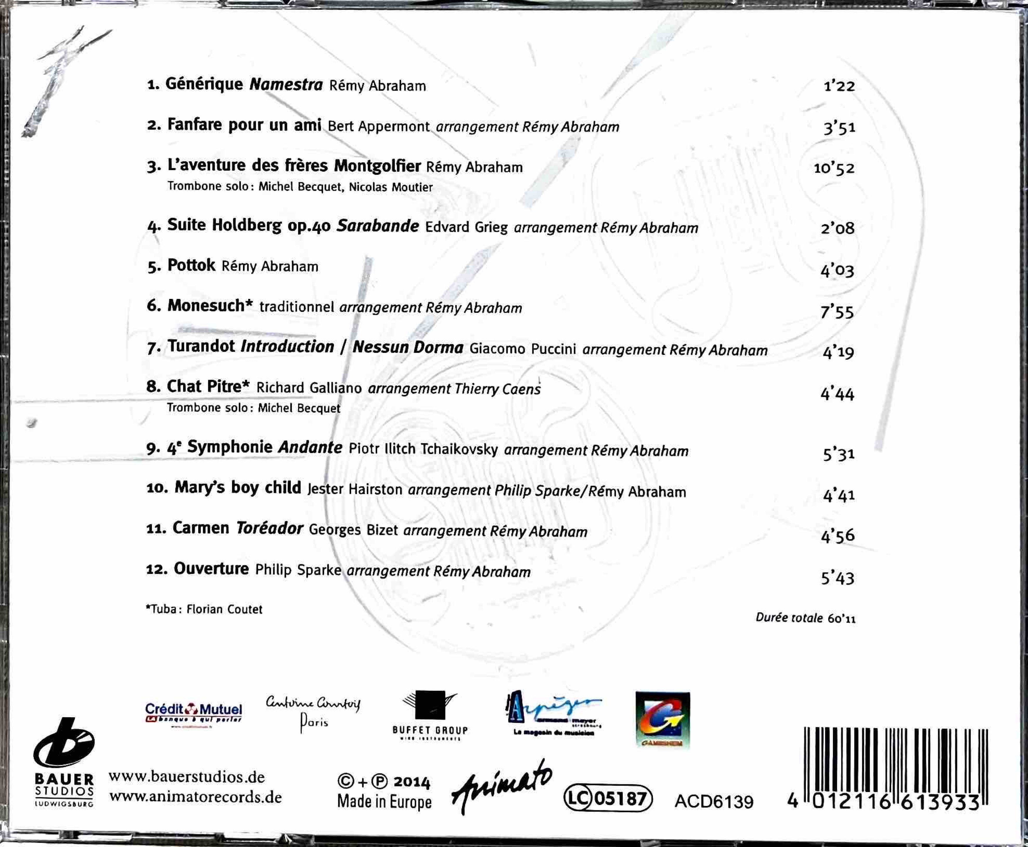 ①Générique Namestra-Rémy Abraham ②Fanfare Pour Un Ami-Bert Appermont(arr.Rémy Abraham) ③L'Aventure Des Frères Montgolfier-Rémy Abraham ④Suite Holdberg Op. 40 Sarabande-Edvard Grieg(arr.Rémy Abraham) ⑤Pottok-Rémy Abraham ⑥Monesuch-Traditionnel(arr.Rémy Abraham) ⑦Turandot Introduction-Nessun Dorma-Giacomo Puccini(arr.Rémy Abraham) ⑧Chat Pitre-Richard Galliano(arr.Thierry Caens) ⑨4e Symphonie Andante-Piotr Ilitch Tchaikovsky(arr.Rémy Abraham) ⑩Mary's Boy Child-Jester Hairston(arr.Rémy Abraham) ⑪Carmen Toréador-Georges Bizet(arr.Rémy Abraham) ⑫Ouverture-Philip Sparke(arr.Rémy Abraham)